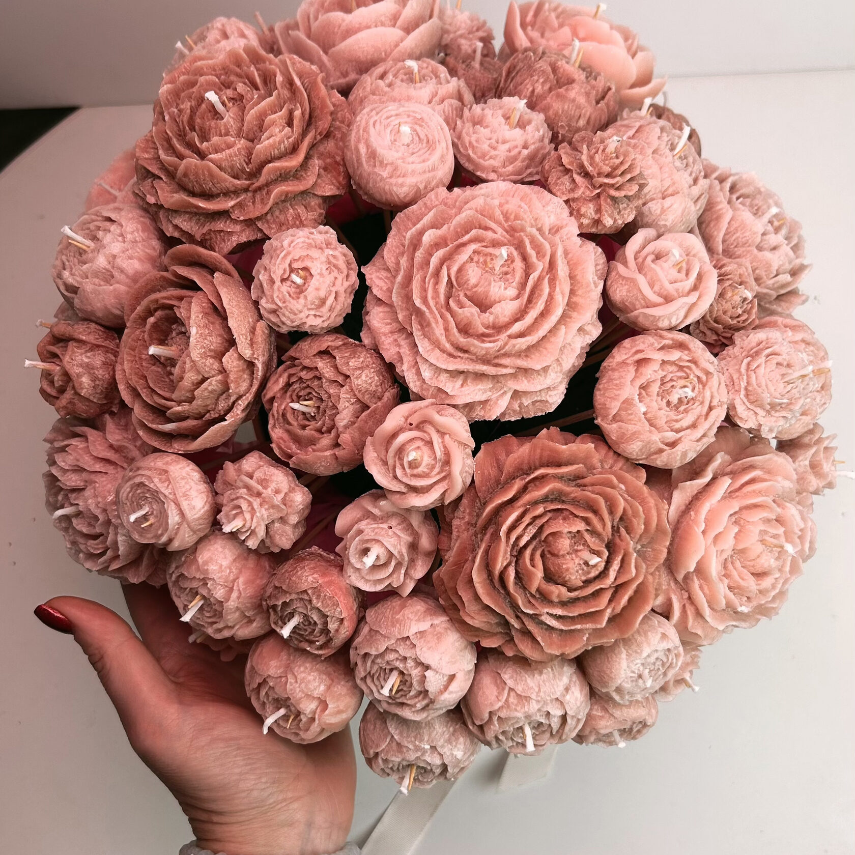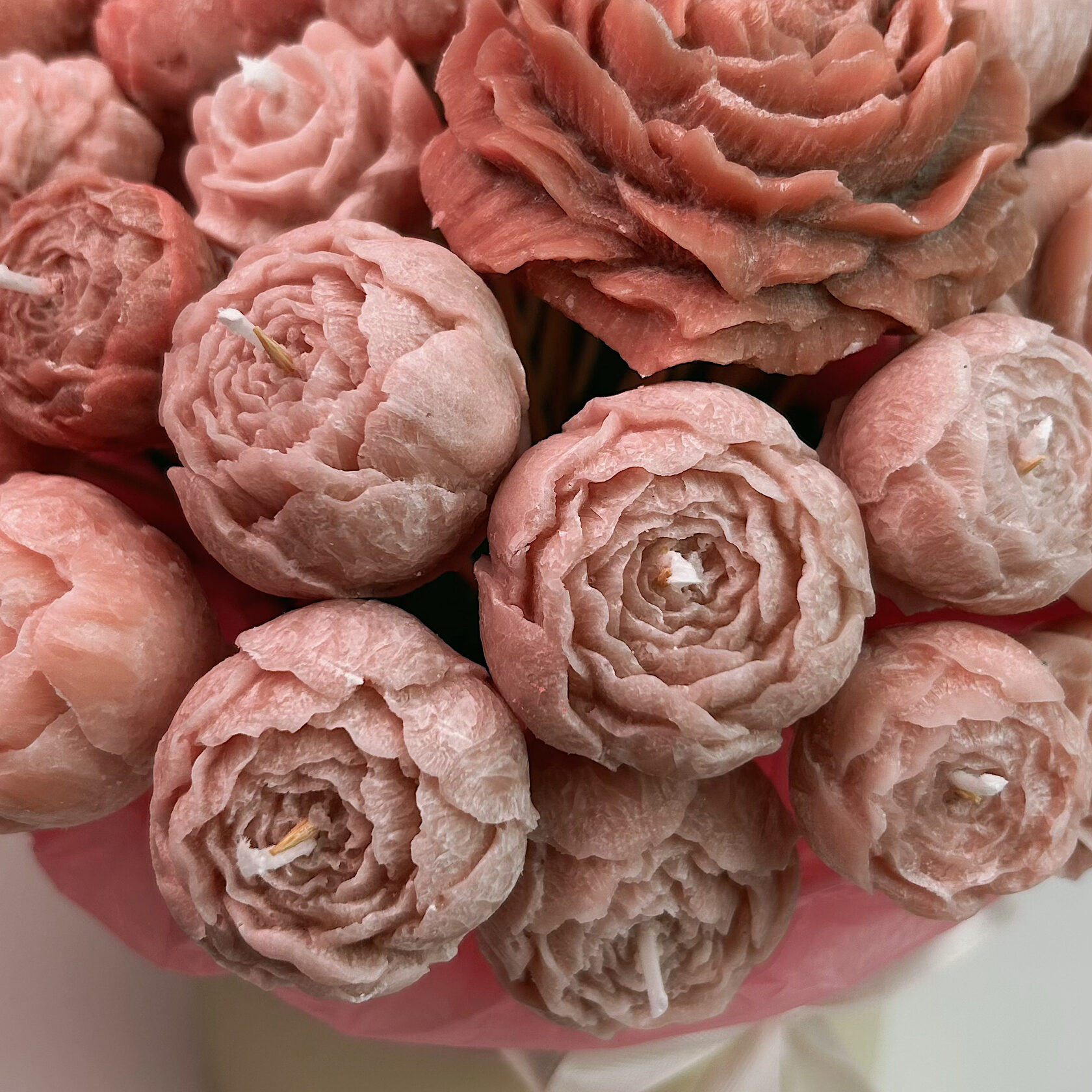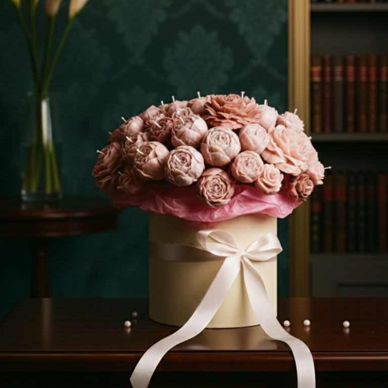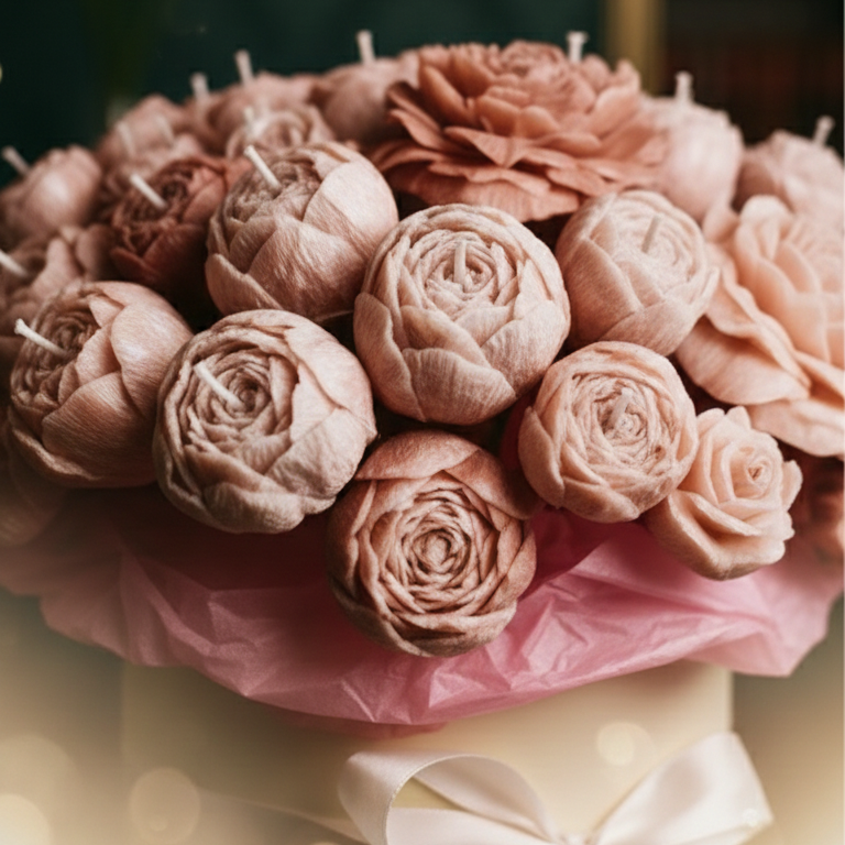 Этот букет выглядит как классическая цветочная композиция, но в нём есть секрет. Каждый «цветок» — это свеча, аккуратно сформированная вручную, с живой фактурой лепестков и мягким, тёплым светом.