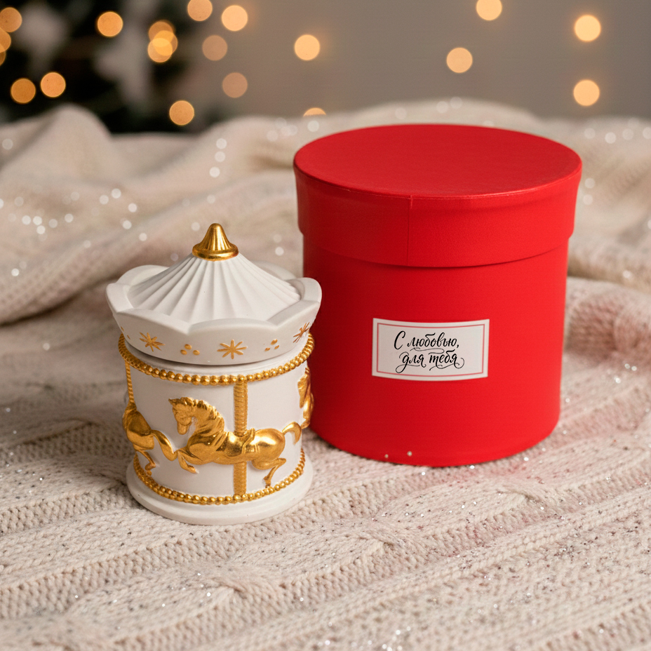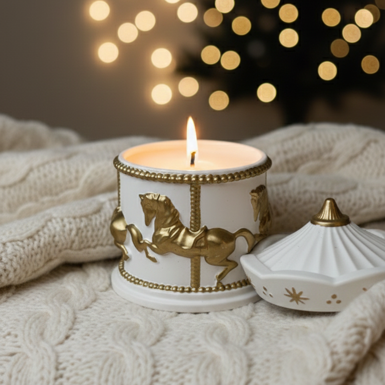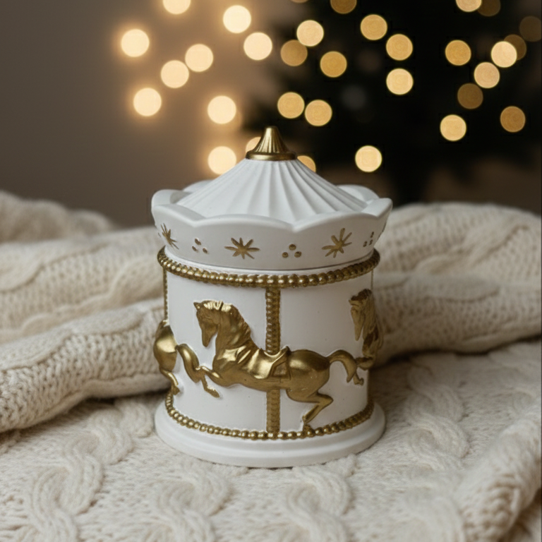 Есть вещи, которые сами по себе создают настроение. Эта свеча — именно такая. Миниатюрная карусель с золотыми лошадками, будто из рождественской витрины — открываешь крышку, и внутри прячется воск с фактурой «замёрзшего стекла»: лёгкие морозные узоры, сверкающие при свете фитиля.