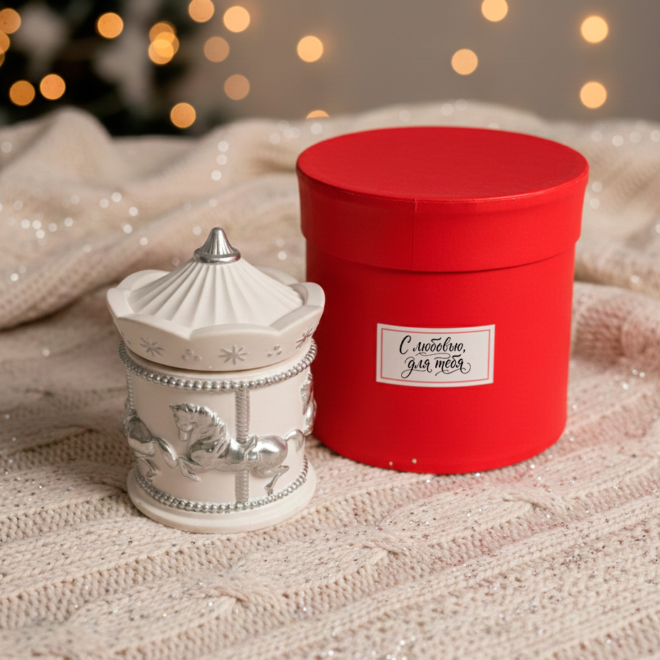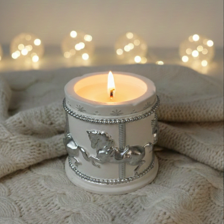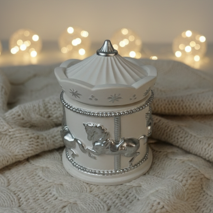 Есть вещи, которые сами по себе создают настроение. Эта свеча — именно такая. Миниатюрная карусель с серебряными лошадками, будто из рождественской витрины — открываешь крышку, и внутри прячется воск с фактурой «замёрзшего стекла»: лёгкие морозные узоры, сверкающие при свете фитиля.