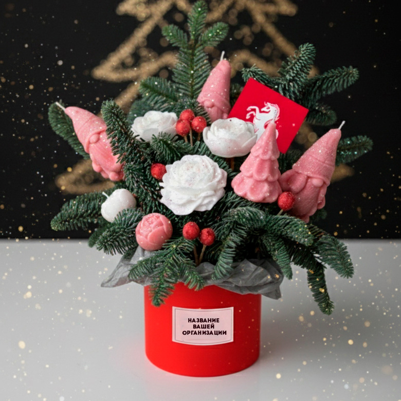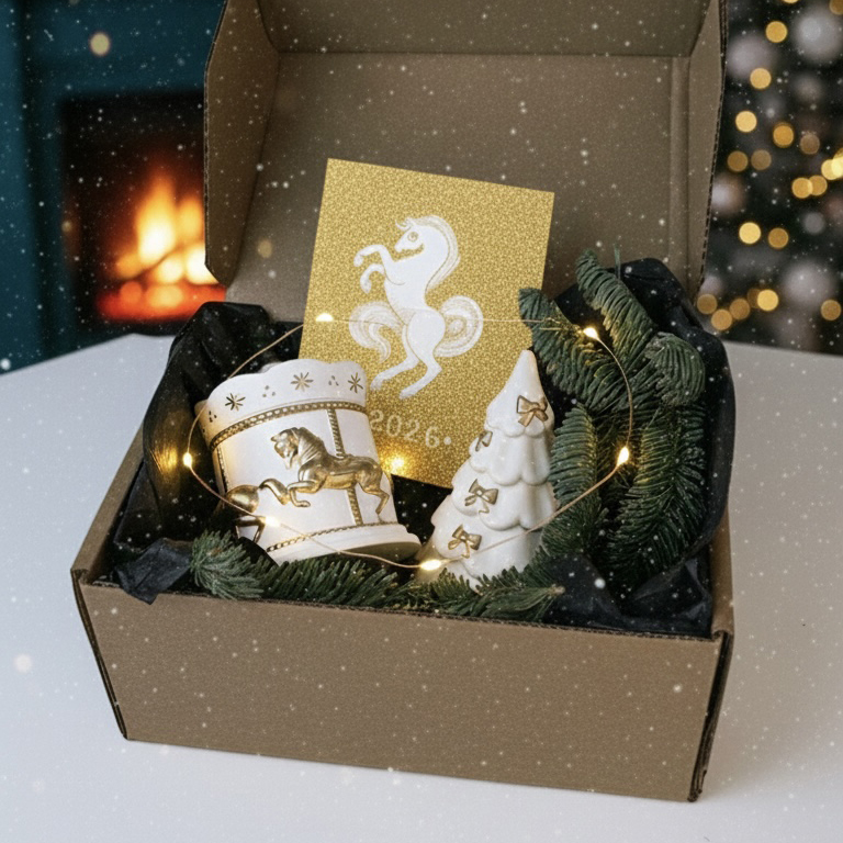 1. Свеча «Ёлочка» в гипсовом подсвечнике. Это очаровательное двухкомпонентное изделие: прочный гипсовый подсвечник, отлитый в форме пушистой ёлочки, и сама восковая свеча с деревянным фитилём, которая идеально в него встроена. Натуральный деревянный фитиль при горении создает уютное потрескивание, напоминающее звук камина. После того как свеча догорит, вы получите изящный гипсовый подсвечник, в который можно вставлять новые свечи-таблетки или использовать как самостоятельный интерьерный декор. 2. Свеча «Карусель с лошадками». Главная героиня набора — изящная свеча, в нежный воск которой вписана целая история. Внутри, словно в хрустальном шаре времени, застыла праздничная карусель с резными лошадками. С каждым часом горения, по мере того как тает воск, волшебная карусель будет открываться вашему взору всё больше, делая каждый вечер у камина или праздничного стола по-настоящему магическим. 3. Открытка ручной работы «Лошадка». Завершает композицию уникальная поздравительная открытка, созданная вручную. На её лицевой стороне красуется грациозная лошадка — символ года, силы и движения вперёд. Это маленькое произведение искусства для самых тёплых и искренних пожеланий. 4. Гирлянда на батарейках. 5. Ветки свежей ели.