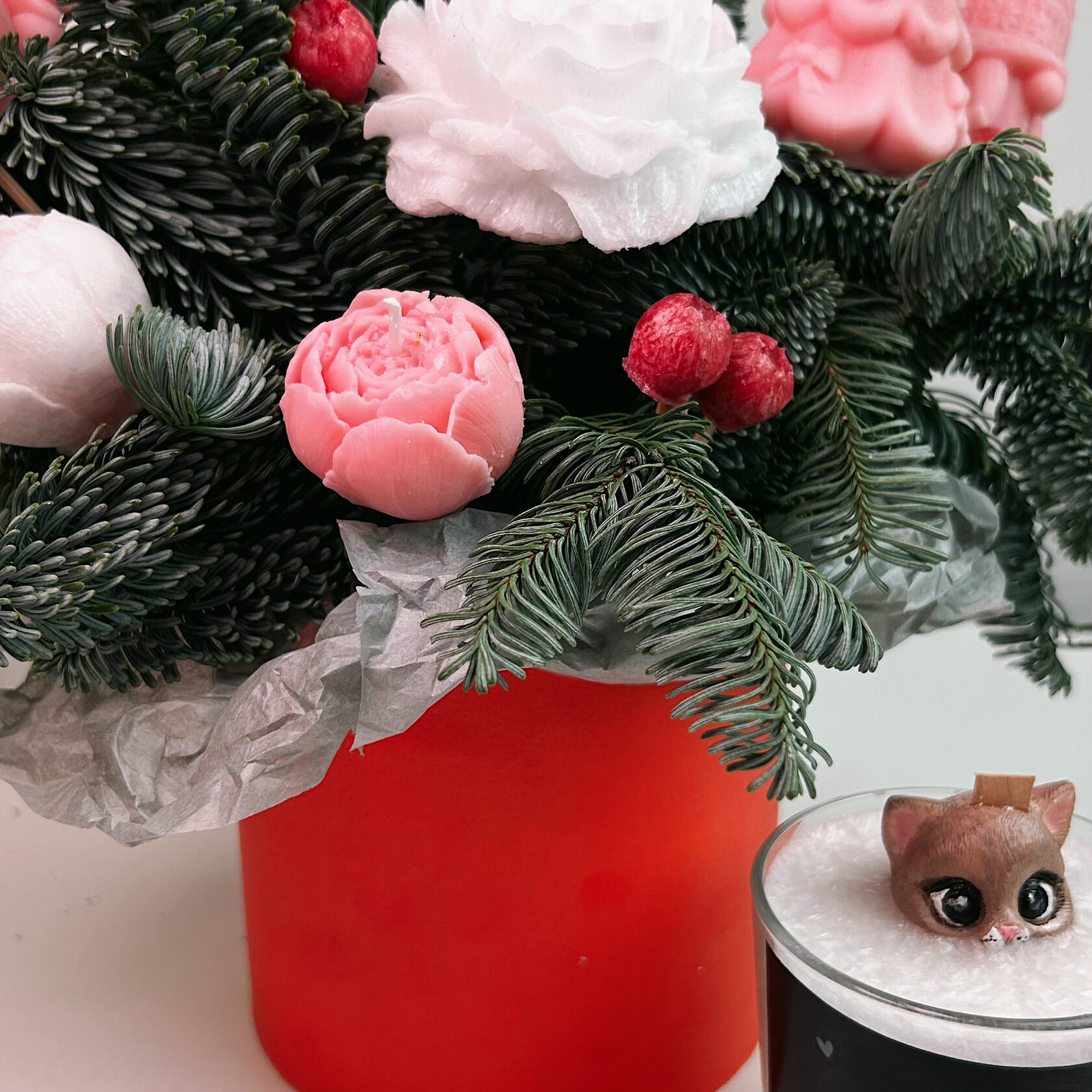 Каждый котик здесь раскрашен вручную, поэтому у каждого — свой взгляд, своё настроение и свой маленький характер. Когда вы открываете крышку коробки, кажется, что котик спрятался в чашке тёплого молочка и робко выглядывает наружу — будто спрашивает: «Ты меня зажжёшь?»