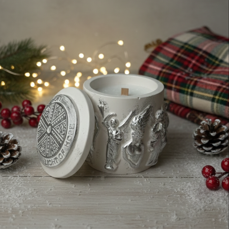 · Элегантный дизайн: ажурный гипс с ангелами добавляет набору праздничной торжественности. · Натуральные материалы: воск, гипс, деревянный фитиль. · Интерактивность: свеча-карусель с сюрпризом и игра света в подсвечнике. · Стиль: рождественский классика, винтаж, ручная работа.