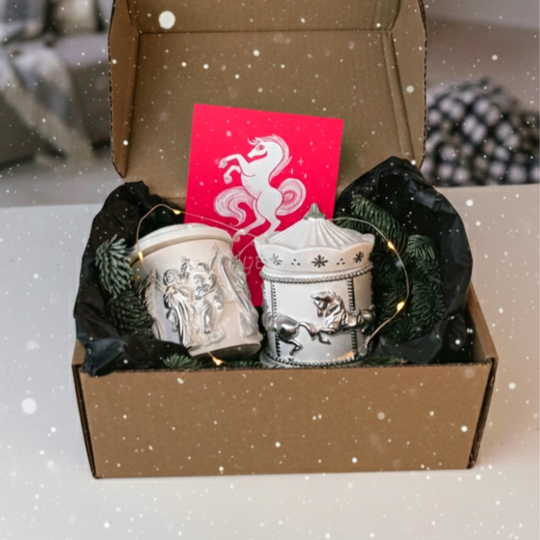 1. Свеча «Ангельское сияние» в гипсовом подсвечнике. Изюминка набора — изящная композиция, где ажурный гипсовый подсвечник, украшенный рельефными фигурками ангелов, служит оправой для самой восковой свечи с деревянным фитилём. Мягкий свет, проходящий через гипсовые детали, будет отбрасывать на стены нежную кружевную тень, создавая таинственную и торжественную атмосферу. Деревянный фитиль добавит уюта своим тихим потрескиванием. После того как свеча догорит, вы останетесь с изысканным интерьерным подсвечником, напоминающим о празднике. 2. Свеча «Карусель с лошадками». Красивая героиня набора — свеча-открытие, в прозрачный или цветной воск которой вписана целая история. Внутри, словно застывшая в янтаре времени, находится миниатюрная праздничная карусель с резными лошадками. С каждым часом горения волшебство тепла и света создаст ощущение чуда и превратит обычный вечер в сказку. 3. Открытка ручной работы «Лошадка». Завершает ансамбль уникальная поздравительная открытка созданная вручную. На её лицевой стороне изображена благородная лошадка — символ года, удачи и стремительного движения к мечтам. Это маленький арт-объект для ваших самых тёплых слов. 4. Гирлянда на батарейках 5. Свежие еловые ветки