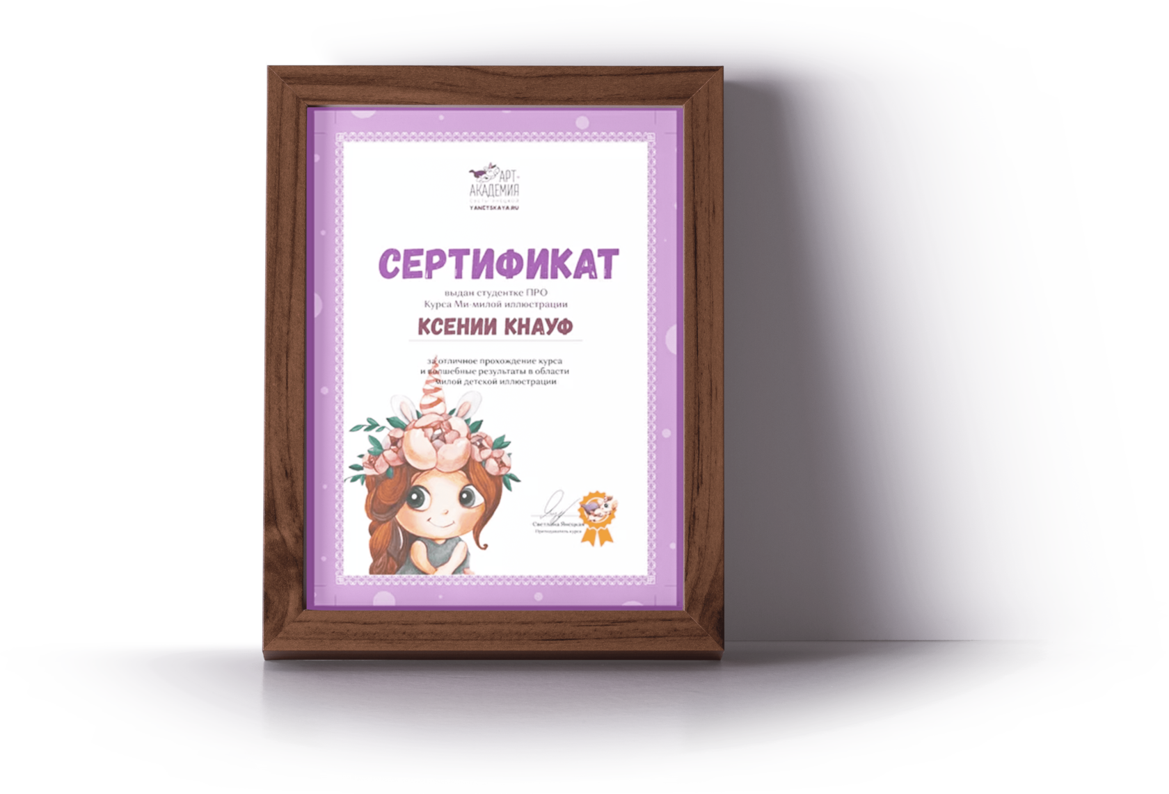 подтверждающий ваше успешное прохождение курса по Милой коммерческой иллюстрации, что станет отличным дополнением к вашему портфолио и весомым аргументом при устройстве в издательство